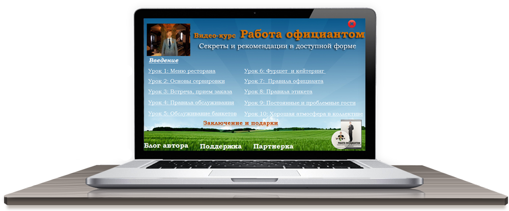 Добрый день! Меня зовут Николай Вилков! C 1996 года работаю официантом,за эти годы приобрел весомый опыт, которым хочу поделиться в этом курсе Когда я решил стать официантом, то длительное время искал курсы, ездил по библиотекам, книжным рынкам в поисках информации. После длительных поисков толковых фильмов, книг, методических пособий, видео-курсов о том, как научится профессии официанта я понял - на просторах Рунета их не существует! Вся литература, которую я находил, предназначена для руководителей или учредителей ресторана, иногда для поваров. Написаны эти книги довольно сложным для восприятия языком, и многие зарубежными авторами. В некоторых пособиях рассказывают о том, как открыть ресторан, набрать персонал, повысить продажи, организовать акции, правильно подобрать оборудование для кухни или концепцию ресторана в целом. Авторы таких книг обычные маркетологи, критики, рестораторы, копирайтеры, литераторы, но не практики. Самые важные навыки официант может получить лишь на мероприятиях самого высокого уровня. Мне приходится работать на обслуживаниях, где в числе приглашенных президенты государств, губернаторы, мэры,министры, олигархи, главы различных силовых и религиозных ведомств, известные ведущие, бизнесмены и артисты.